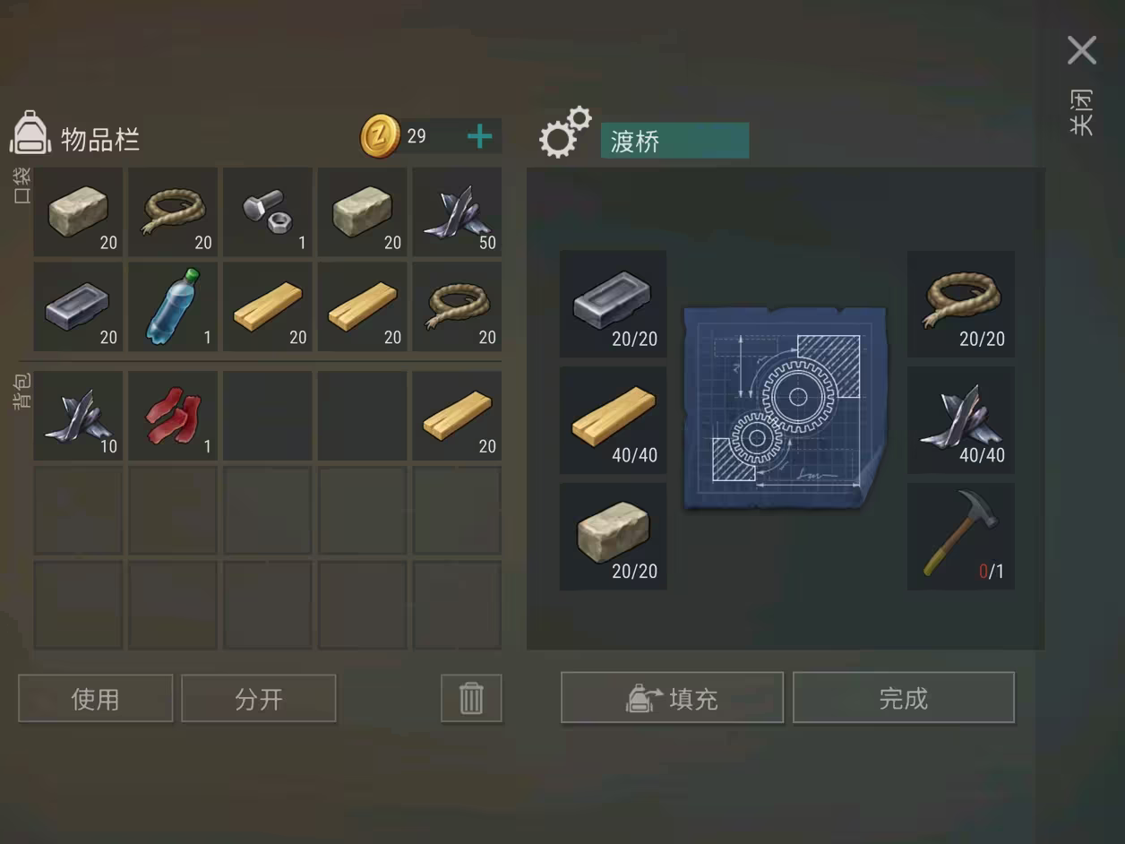 首先要砍木頭,用來做木板和熔爐的燃料,順便帶回繩子跟廢金屬回來,當修橋物料都加工完成,就可以帶倆個武器,去修橋了。